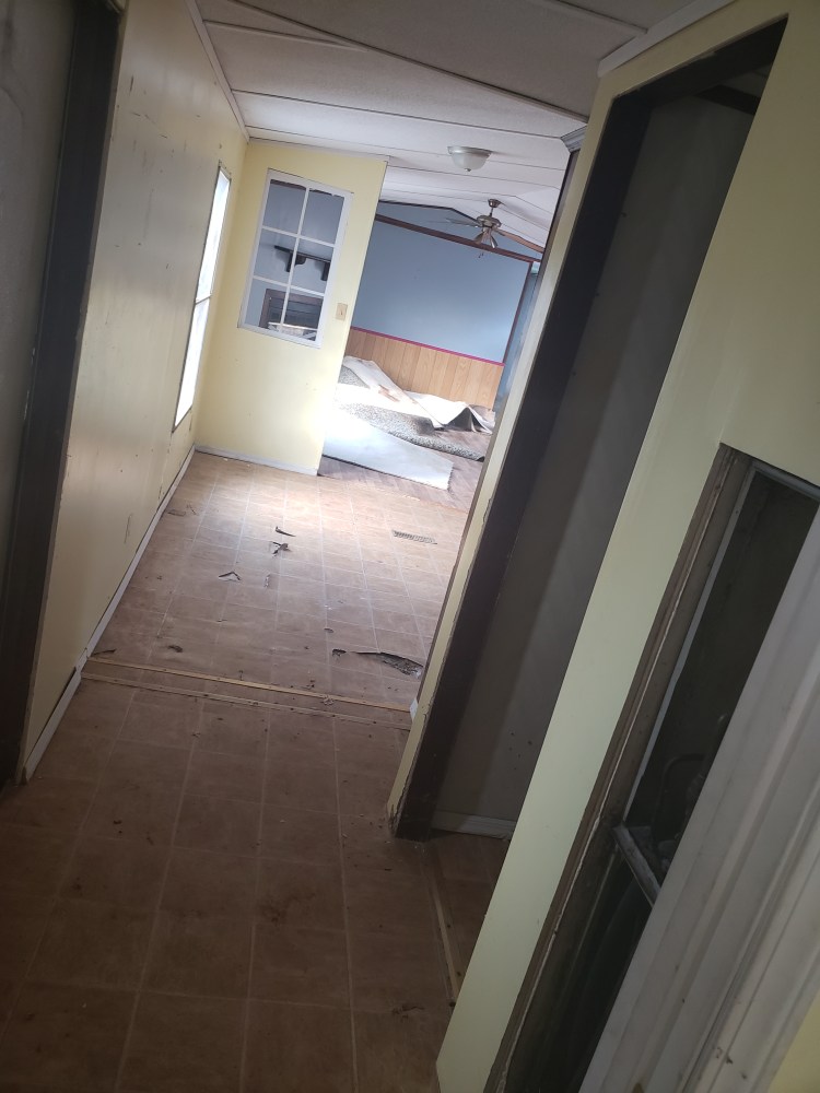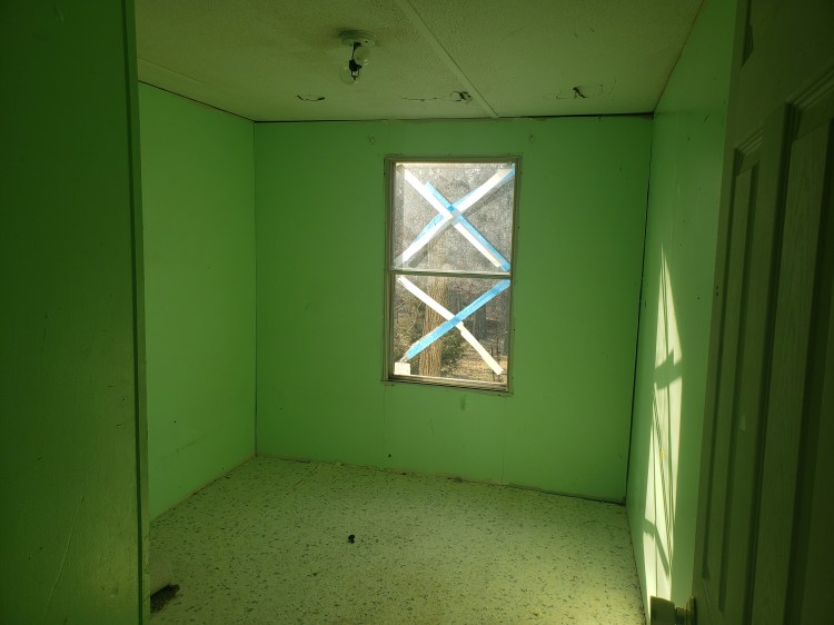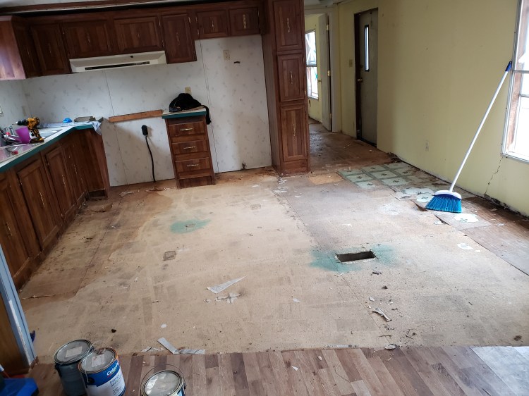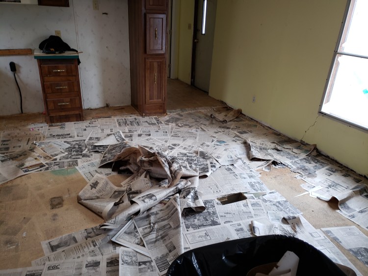 Day two of working on the mobile home was mostly spent cleaning (there have been quite a few days that at least half the day was spent cleaning). The previous owners had remodeled the home, and some of the work had to be redone. A re-remodel, if you will. Definitely the phrase “Make due with what you’ve got” came to mind as we have been seeing some of the previous work. Granted, I don’t have any negative feelings towards the previous owners, or the person that did the work. I definitely believe that the previous owners were trying to keep costs low, and I will give them the benefit of the doubt. They did what they must have had to do. I will say there was quite a bit of ingenuity that went in to some of the previous work. And some of the previous work left me scratching my head in bewilderment. I will say, I have not once thought of using newspaper for underlayment, but I gaurantee they saved a lot of money in doing so. I’m also sure they did not spend much on screws and used what was on hand, as the screws in the subfloor were a hodgepodge of different sized Torx deck screws and Phillips drywall screws. I can respect the previous owners for using what was on hand. As for me, I would rather use the right tool for the right job, but to each his own.