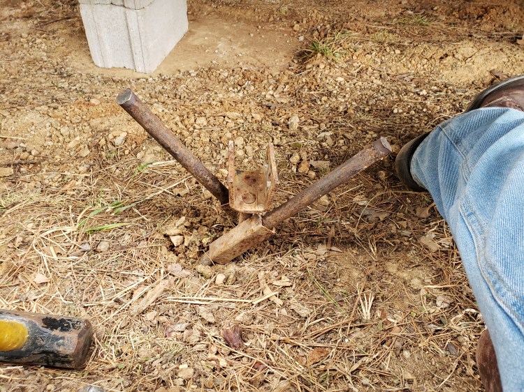 The first order of business when our home was delivered was to tie the home down. This was a simple task that took a couple hours. I found that the easiest way to hammer the tie downs was to place a piece of 2×6 scrap in the channel of the tie down. This serves two purposes. First, it gives you something to strike to drive the center stake into the ground. Second, it gives you something to hold on to – a kind of makeshift handle as you drive the larger stakes through the sides. Of course, for those of you familiar with the area, we ran into your typical Washington County topsoil. For those who are unfamiliar with good ol’ Washington County topsoil, you may be familiar with the term rock.