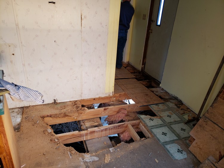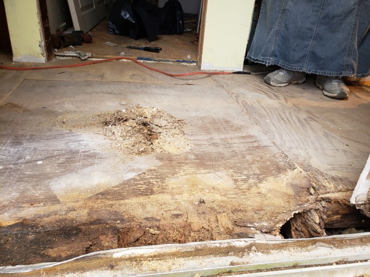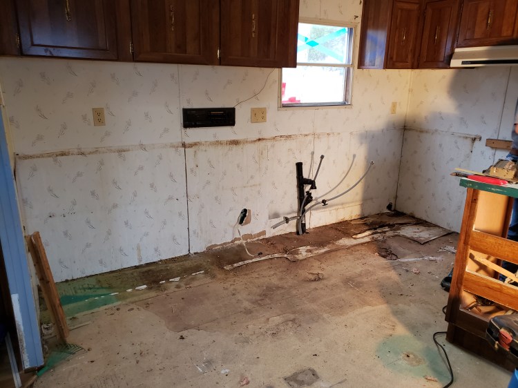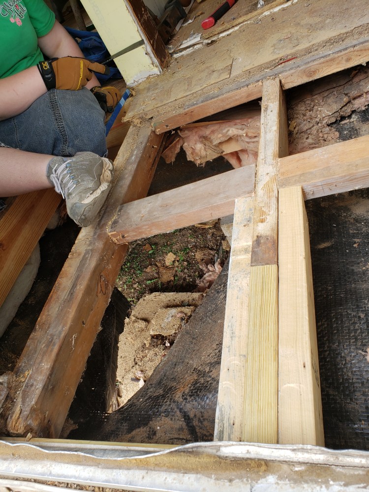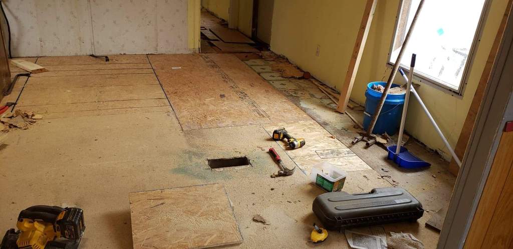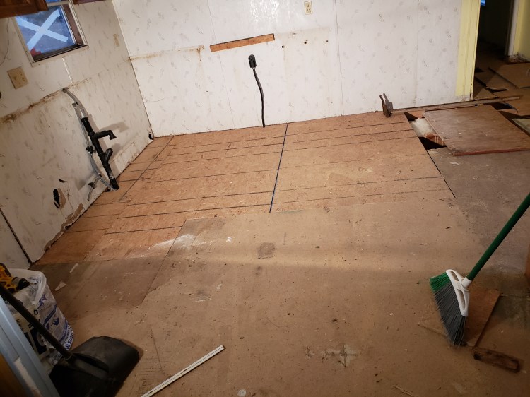 The hallway and the kitchen were both simpler than the bedroom, because the subfloor was dry and came up in larger pieces. The only issue was having to replace over 30 feet of band board, and to reframe the hallway.